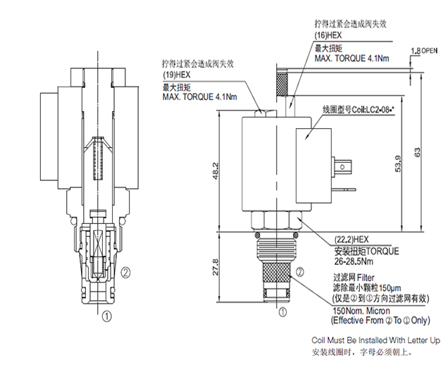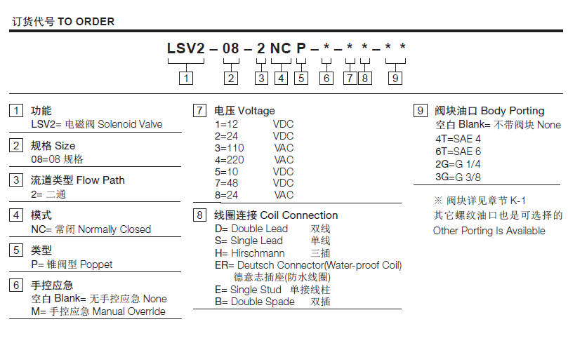 流量請(qǐng)查看《壓力-流量曲線圖》插孔08-2過濾參考《油液清潔度》最大工作壓力207bar內(nèi)泄漏2 drops/min.(滴/分)max. at 207bar溫度-40°F to +212°F(-40°C to +100°C)線圈額定負(fù)載Continuous from 85% to 115% of nominal voltage(連續(xù)工作電壓)油液Mineral-based fluids with viscosities of 7.4 to 420 cSt.(礦物油粘度)閥塊材料6061-T6鋁,允許使用最大壓力207bar 鋼和球鐵允許使用最大壓力350bar