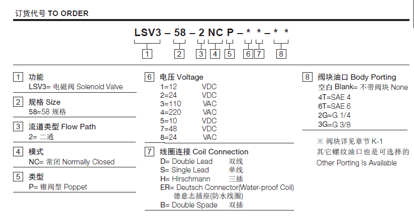 工作壓力207Bar流量請查看《壓力-流量曲線圖》插孔08-2過濾參考《油液清潔度》內(nèi)泄漏2 drops/min.(滴/分)max. at 207bar溫度-40°F to +212°F(-40°C to +100°C)線圈額定負載Continuous from 85% to 115% of nominal voltage(連續(xù)工作電壓)油液Mineral-based fluids with viscosities of 7.4 to 420 cSt.(礦物油粘度)閥塊材料6061-T6鋁,允許使用最大壓力207bar 鋼和球鐵允許使用最大壓力350bar -