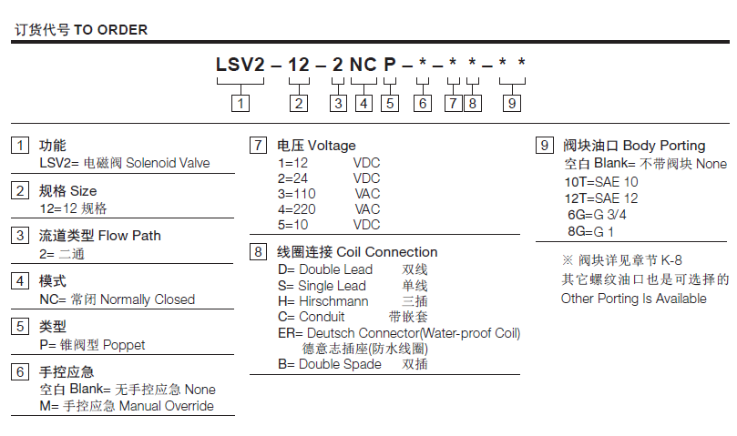 流量請查看《壓力-流量曲線圖》插孔12-2過濾參考《油液清潔度》最大工作壓力207Bar內(nèi)泄漏3 drops/min.(滴/分)max. at 207bar溫度-40°F to +212°F(-40°C to +100°C)線圈額定負載Continuous from 85% to 115% of nominal voltage(連續(xù)工作電壓)油液Mineral-based fluids with viscosities of 7.4 to 420 cSt.(礦物油粘度)閥塊材料6061-T6鋁,允許使用最大壓力207bar 鋼和球鐵允許使用最大壓力350bar -