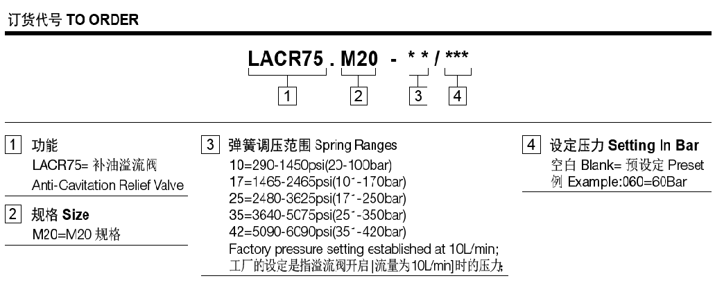 351 to 420 bar;溫度-40oF to +250oF(-40oC to +120oC)油液Mineral-based fluids with viscosities of 7.4 to 420 cSt.(礦物油粘度)閥塊材料鋼和球鐵允許使用最大壓力350bar -