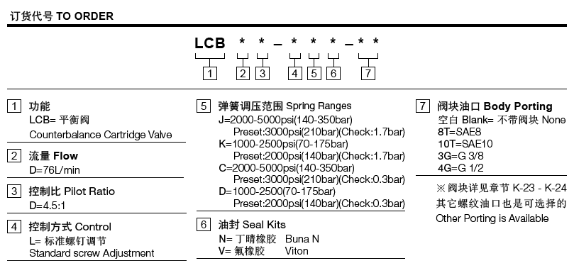 工作壓力350bar流量請(qǐng)查看《壓力-流量曲線圖》插孔SUN T-2A過(guò)濾參考《油液清潔度》最大負(fù)載270bar內(nèi)泄漏5 drops/min.(滴/分)控制比4.5:1溫度-40oF to +250oF(-40oC to +120oC)油液Mineral-based fluids with viscosities of 7.4 to 420 cSt.(礦物油粘度)閥塊材料6061-T6鋁,允許使用最大壓力207bar 鋼和球鐵允許使用最大壓力350bar -