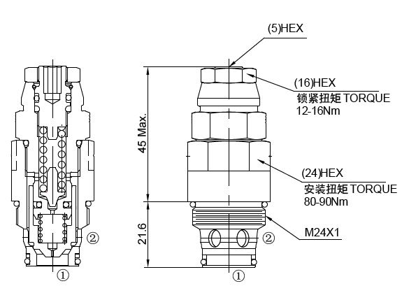 閥體①口和②口不通,直到①口壓力超過設(shè)定壓力且打開先導(dǎo)閥芯。這樣,先導(dǎo)閥芯