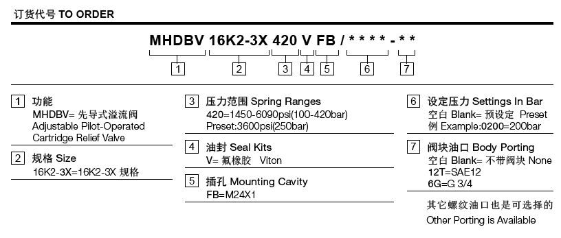 工作壓力420bar流量請查看《壓力-流量曲線圖》插孔Rexroth-FB過濾參考《油液清潔度》內(nèi)泄漏15 drops/min. (15滴/分) max. to 70% of nominal setting溫度-40oF to +250oF(-40oC to +120oC)油液Mineral-based fluids with viscosities of 7.4 to 420 cSt.(礦物油粘度)閥塊材料鋼和球鐵允許使用最大壓力350bar -