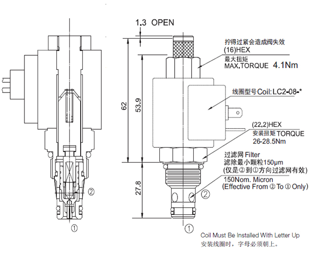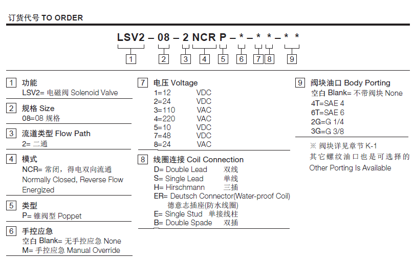 插孔08-2過(guò)濾參考《油液清潔度》最大工作壓力207Bar內(nèi)泄漏2 drops/min.(滴/分) max. at 207bar溫度-40°F to +212°F(-40°C to +100°C)線圈額定負(fù)載Continuous from 85% to 115% of nominal voltage(連續(xù)工作電壓)油液Mineral-based fluids with viscosities of 7.4 to 420 cSt.(礦物油粘度)閥塊材料6061-T6鋁,允許使用最大壓力207bar 鋼和球鐵允許使用最大壓力350bar -