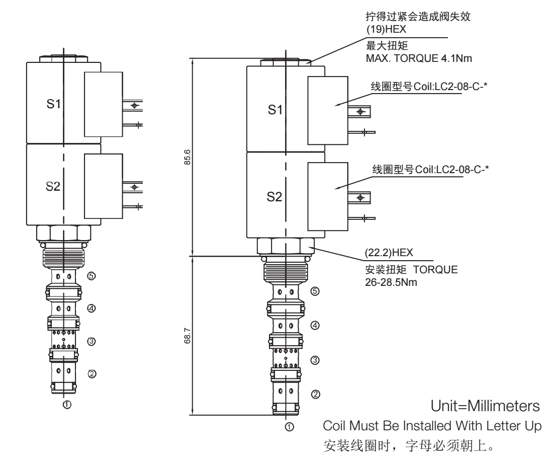 當(dāng)線圈 S2 得電時(shí),允許油液⑤口到④口,②口到③口流動(dòng)。