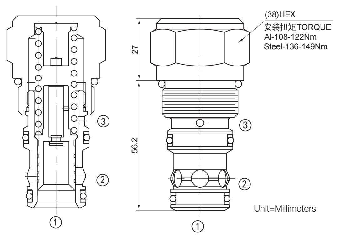 當(dāng)①口的油壓克服彈簧設(shè)定壓力時,油液從①口到②口流動,③口的壓力疊加到了彈