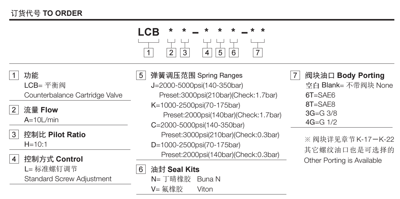流量請(qǐng)查看《壓力-流量曲線圖》插孔SUN T-11A過濾參考《油液清潔度》最大設(shè)定值350bar最大負(fù)載270bar內(nèi)泄漏5 drops/min.(滴/分)控制比10:1溫度-40oF to +250oF(-40oC to +120oC)油液Mineral-based fluids with viscosities of 7.4 to 420 cSt.(礦物油粘度)閥塊材料6061-T6鋁,允許使用最大壓力207bar 鋼和球鐵允許使用最大壓力350bar -