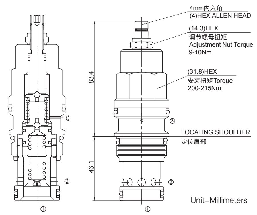的設(shè)定壓力取決于外泄口(油口③)。此閥的設(shè)定值對(duì)②口的背壓不敏感。如果回路