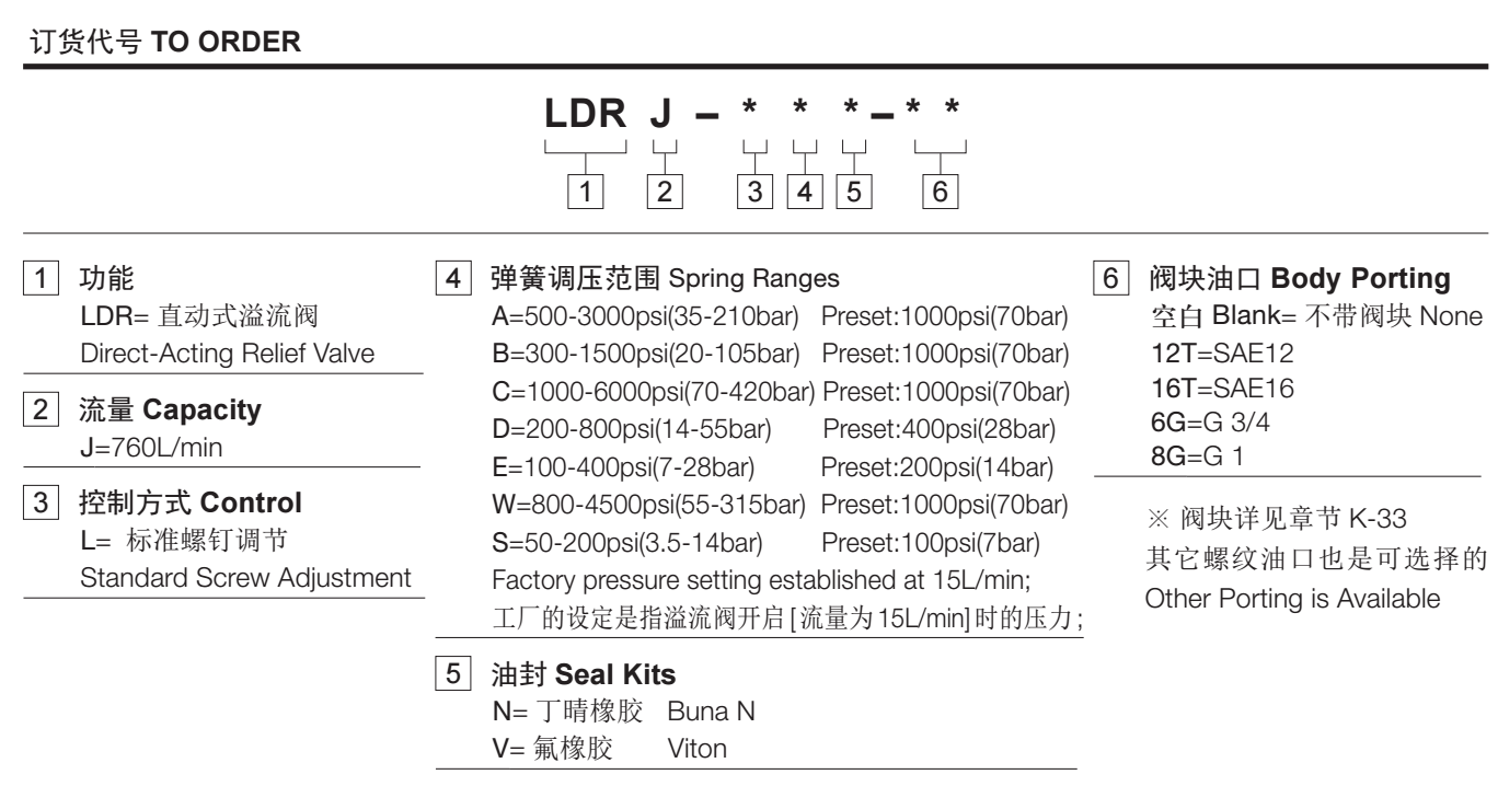 S 3.5-14bar;Preset(預設定): 7bar溫度-40oF to +250oF(-40oC to +120oC)油液Mineral-based fluids with viscosities of 7.4 to 420 cSt.(礦物油粘度)閥塊材料鋼和球鐵允許使用最大壓力350bar -