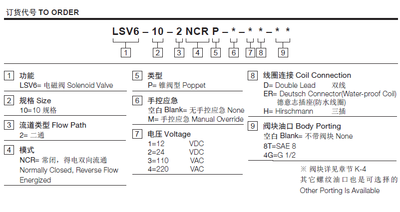 流量請(qǐng)查看《壓力-流量曲線圖》插孔10-2過濾參考《油液清潔度》最大工作壓力350Bar內(nèi)泄漏3 drops/min.(滴/分) max. at 350bar溫度-40°F to +212°F(-40°C to +100°C)線圈額定負(fù)載Continuous from 85% to 115% of nominal voltage(連續(xù)工作電壓)油液Mineral-based fluids with viscosities of 7.4 to 420 cSt.(礦物油粘度)閥塊材料鋼和球鐵允許使用最大壓力350bar -